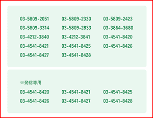 「03-5809-2051」「03-5809-2330」「03-5809-2423」「03-5809-3314」「03-5809-2833」「03-3864-3680」「03-4212-3840」「03-4212-3841」「03-4541-8420」「03-4541-8421」「03-4541-8425」「03-4541-8426」「03-4541-8427」「03-4541-8428」